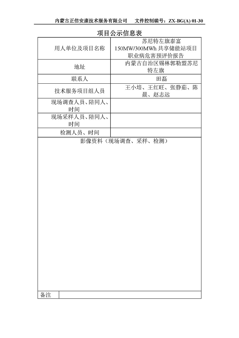 蘇尼特左旗泰富150MW300MWh共享儲能站項目職業(yè)病危害預評價報告信息公示表