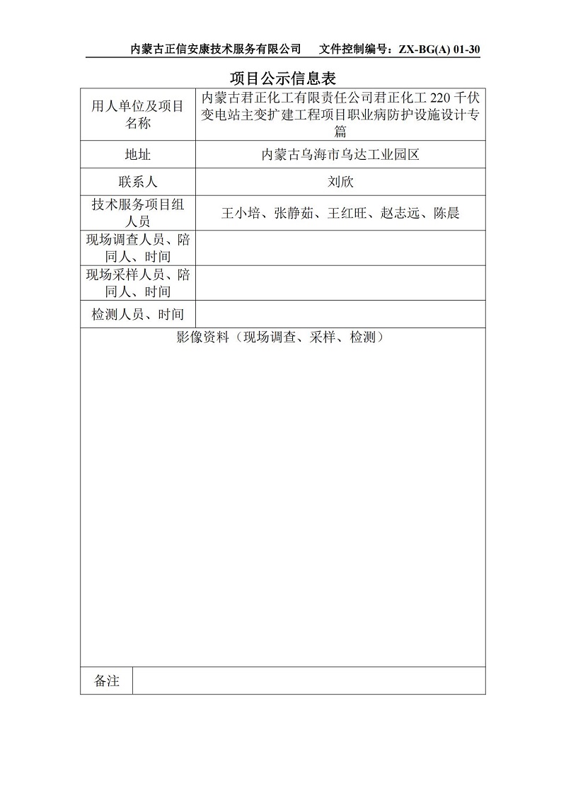 內(nèi)蒙古君正化工有限責(zé)任公司君正化工220千伏變電站主變擴(kuò)建工程項(xiàng)目職業(yè)病防護(hù)設(shè)施設(shè)計(jì)專篇項(xiàng)目公示信息表
