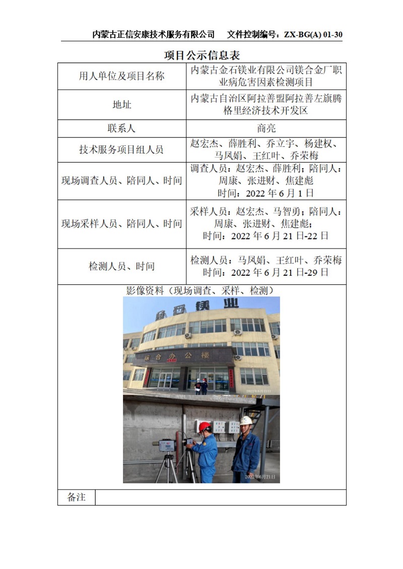 內(nèi)蒙古金石鎂業(yè)有限公司鎂合金廠職業(yè)病危害因素定期檢測項目公示信息表