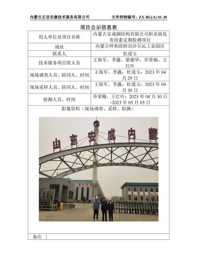 內蒙古安成鋼結構有限公司職業(yè)病危害因素定期檢測項目公示信息表