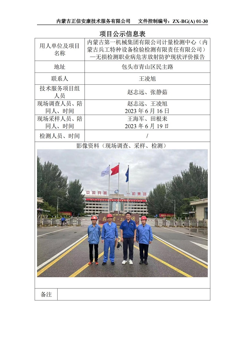 內(nèi)蒙古第一機(jī)械集團(tuán)有限公司計量檢測中心(內(nèi)蒙古兵工特種設(shè)備檢驗檢測有限責(zé)任有限公司)—無損檢測間職業(yè)病危害放射防護(hù)現(xiàn)狀評價報告-項目公示信息表