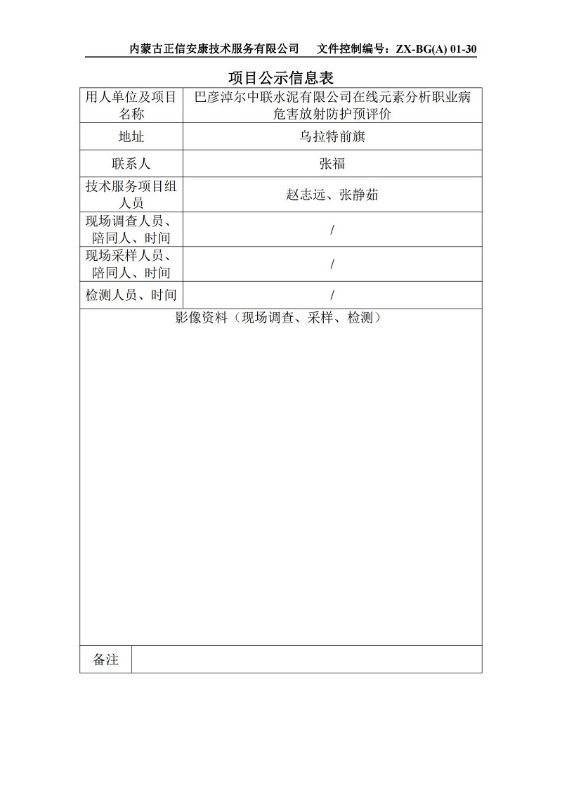 巴彥淖爾中聯(lián)水泥有限公司在線元素分析職業(yè)病危害放射防護預評價-項目公示信息表