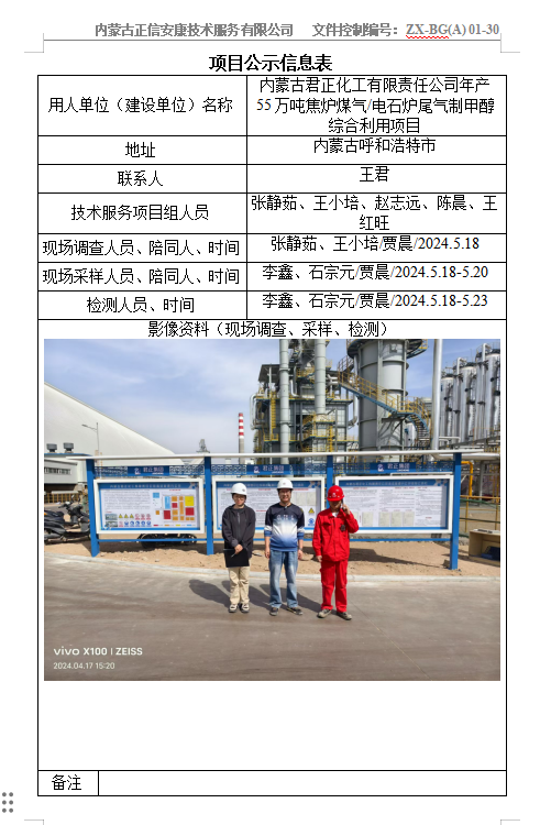 內(nèi)蒙古君正化工有限責任公司年產(chǎn)55萬噸焦爐煤氣/電石爐尾氣制甲醇綜合利用項目職業(yè)病危害控制效果評價